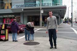 By around two, I was asleep, I guess. At six, I gradually woke up and became aware that Brett is a persistent snorer, at least when he's sick. In fact, he snored constantly until around 8.30, when I fled to Starbucks to escape the noise. The streets outside, in the cold, grey morning, were fairly deserted, and all those on their feet looked like they were under a cloud. Our hotel was right across the street from our frequent haunt, the Metreon Center.