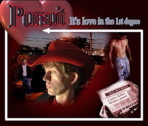 At dusk, on Sunday, I took my friend Terry up the hill towards Twin Peaks to a street I'd chosen as the perfect setting for publicity photos for my next big movie project, "Pursuit." The main character in the movie was somewhat influenced by Terry (a unique and charismatic person who's worth a whole journal entry to himself), and so I'd asked Terry to pose for the publicity still. The movie will be a romantic thriller about a man stalked by a gay serial killer. I was to end up spending my spare hours over the next couple of days in creating a fake movie poster, a version of which you'll see below.